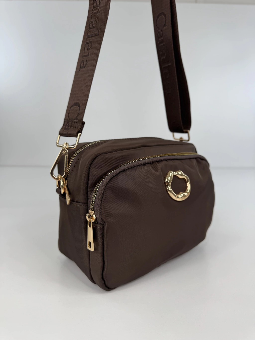 [DESCRIPCION] Presentamos nuestra Bandolera Mood Chocolate By Cataleia, una minibag diseñada para acompañarte desde las primeras horas del día hasta tus salidas nocturnas, fusionando funcionalidad y estilo en un solo accesorio imprescindible. Esta minibag está confeccionada de nylon de calidad, lo que garantiza ligereza y resistencia al uso cotidiano. Sus costuras reforzadas aportan durabilidad, asegurando que cada detalle se mantenga impecable con el paso del tiempo. El diseño cuenta con tres compartimientos principales con cierre de cremallera, ideales para organizar tus objetos esenciales de forma segura. Además, incorpora dos compartimientos internos que te permiten mantener el orden y acceder fácilmente a lo que necesitas. La correa desmontable y regulable te ofrece versatilidad: podés llevarla cruzada o al hombro, mientras que su forrería interna personalizada agrega un toque de distinción. Destacan el detalle de avíos y distintivo de la marca en color oro, que realzan la elegancia y el carácter exclusivo de la bandolera.