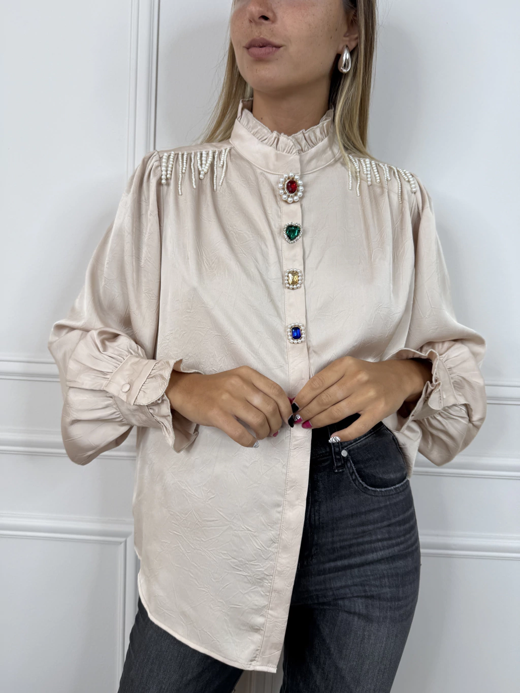[DESCRIPCION]Presentamos la Camisa Corin de nuestra Colección Importados By Cataleia, una prenda que combina elegancia y creatividad, ideal para destacar en cualquier ocasión. Confeccionada en gasa texturada, esta camisa ofrece un encanto especial con su cuello mao adornado con delicados volados. Las mangas largas princesa, junto con los puños con botón forrado a tono y volados, aportan un toque romántico y sofisticado. El cierre delantero con botones a presión y apliques de pedrería fantasía añade un brillo sutil, mientras que el detalle colgante en los hombros de perlas completa el diseño de manera única. Esta pieza, de confección By Cataleia, refleja la dedicación y la calidad en cada detalle, convirtiéndola en una elección imprescindible para cualquier guardarropa.