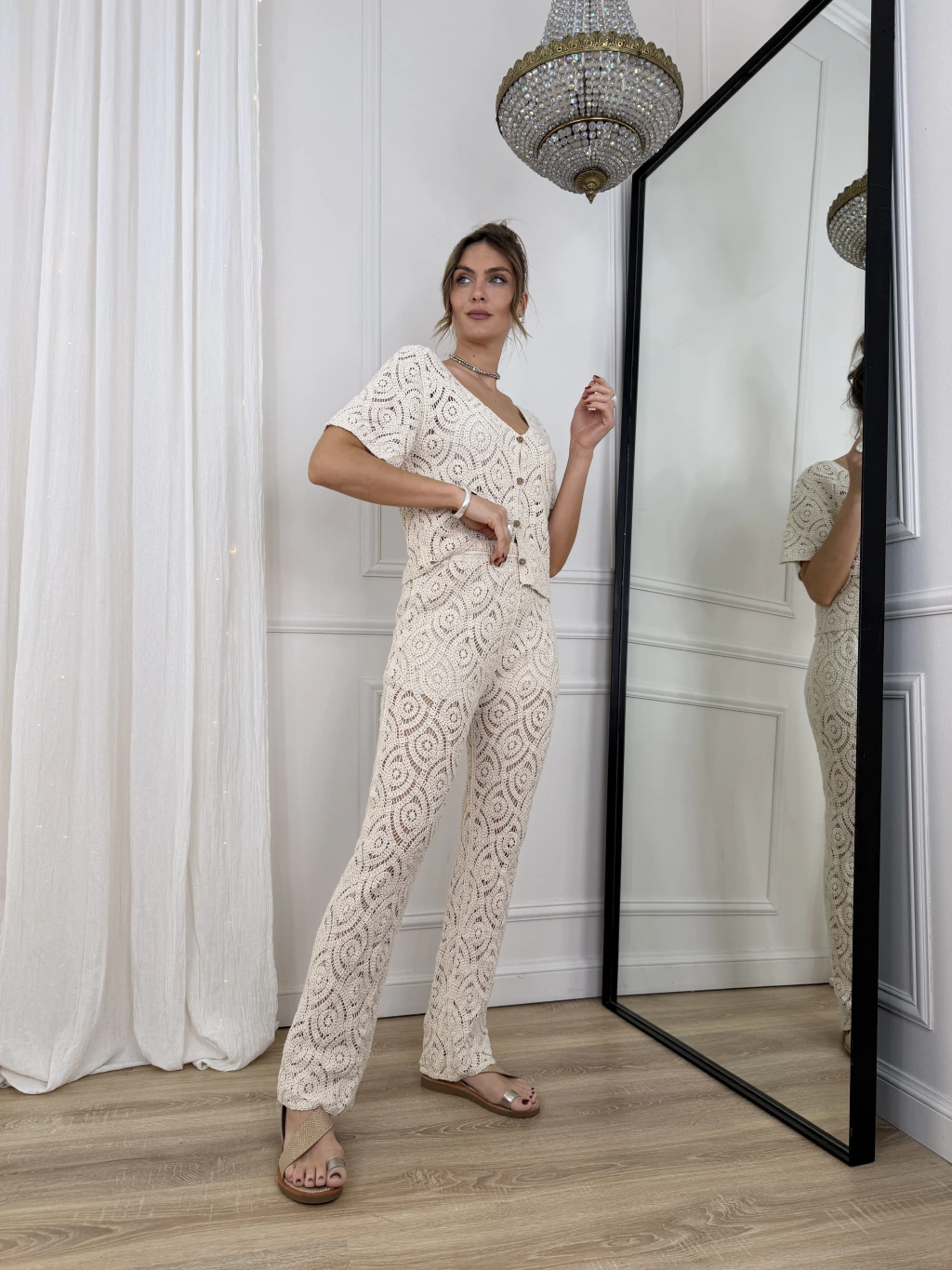 [DESCRIPCION] Presentamos el Pantalón Melanie de nuestra Colección Importados By Cataleia, una pieza que cautiva por su delicado diseño, pensada para quienes buscan destacar con sofisticación y frescura en cada ocasión. Confeccionado íntegramente en hilo de algodón, el Pantalón Melanie asegura una sensación suave y natural sobre la piel, ideal para los días más cálidos del año. Su exclusivo diseño de tejido calado aporta un toque bohemio y femenino, permitiendo sutiles transparencias que realzan la silueta con elegancia. La cintura elástica garantiza un calce cómodo y adaptable, acompañando tus movimientos y brindando mayor practicidad en el uso diario. Además, cuenta con un short interno que ofrece seguridad y confort, permitiéndote lucir el pantalón con total confianza en cualquier situación.