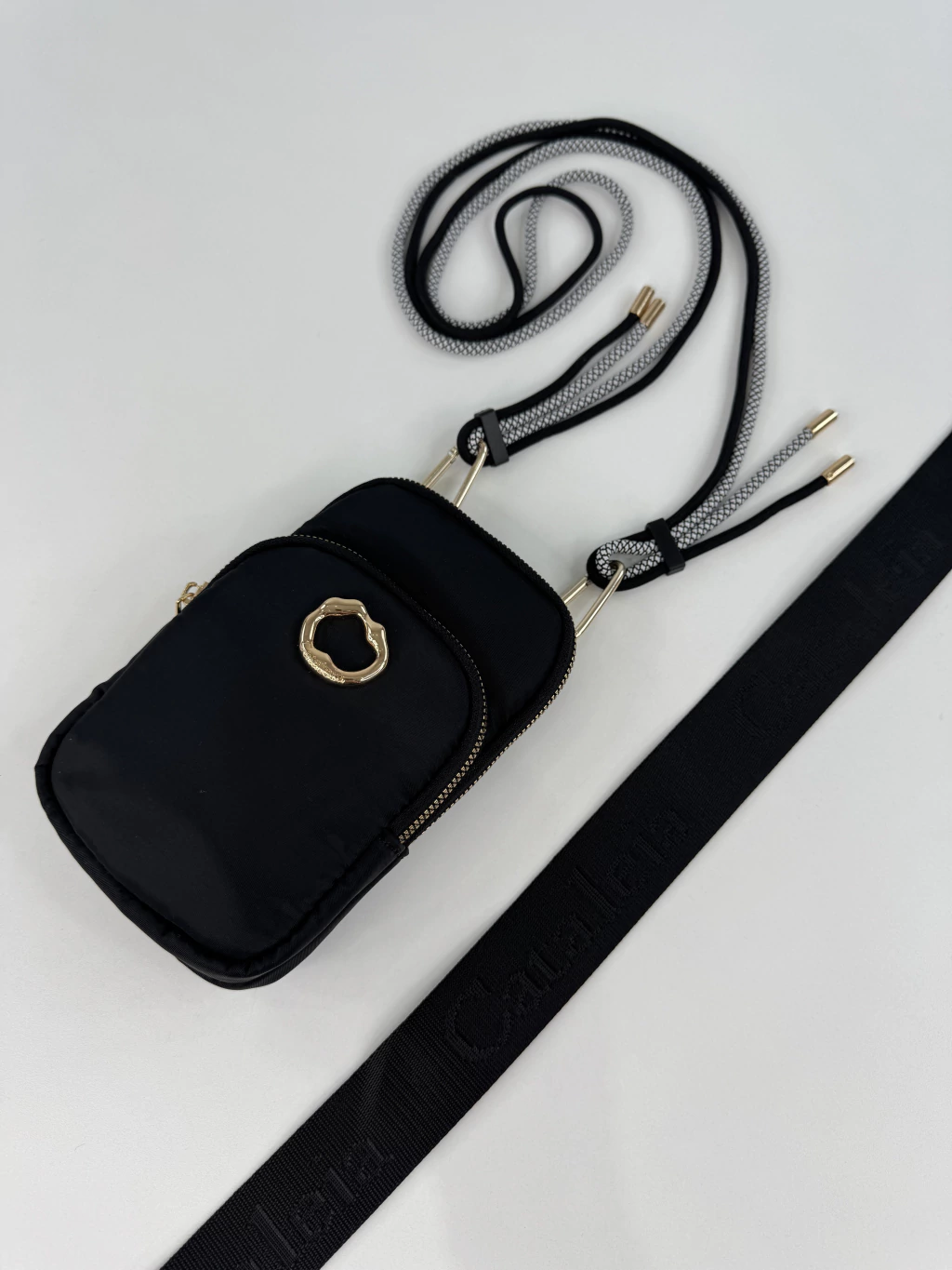 [DESCRIPCION] Presentamos el Portacelular Mood Black By Cataleia, una pieza esencial que redefine la practicidad y el estilo en tu día a día. Diseñado pensando en quienes buscan funcionalidad sin renunciar a la elegancia, este portacelular está confeccionado en nylon de calidad, asegurando durabilidad y resistencia para acompañarte en cada momento. Su diseño cuenta con dos compartimientos principales con cierre de cremallera, ideales para organizar tu celular, llaves y pequeños objetos de uso cotidiano de manera segura y accesible. La doble correa regulable y desmontable te brinda la máxima versatilidad: úsalo cruzado o al hombro, adaptándose perfectamente a tu ritmo y estilo. Los detalles de avíos y el distintivo de nuestra marca en color oro le otorgan un toque sofisticado que realza cada look, convirtiendo este portacelular en un accesorio protagonista, tanto para la rutina urbana como para ocasiones especiales.